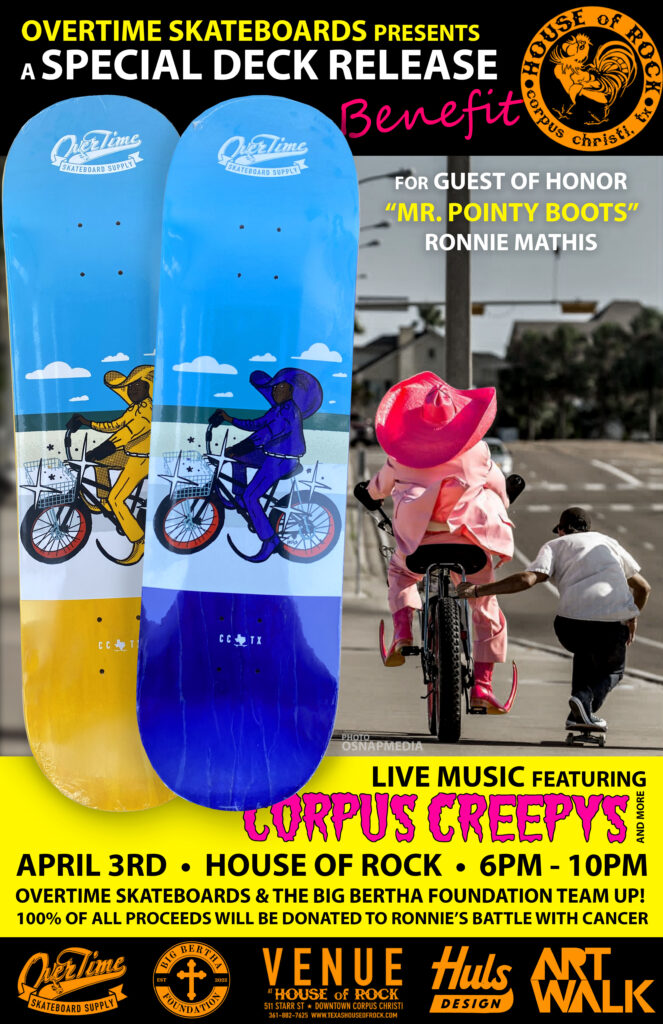 Overtime Skateboards is back! April ArtWalk come join us for a special Deck Release Benefit! 100% of all proceeds from Overtime Skateboards & The Big Bertha Foundation will be donated to local legend “Mr. Pointy Boots” Ronnie Mathis’ battle with cancer OT’s first line of boards since 2019; featuring artwork by Huls Design honoring Corpus […]